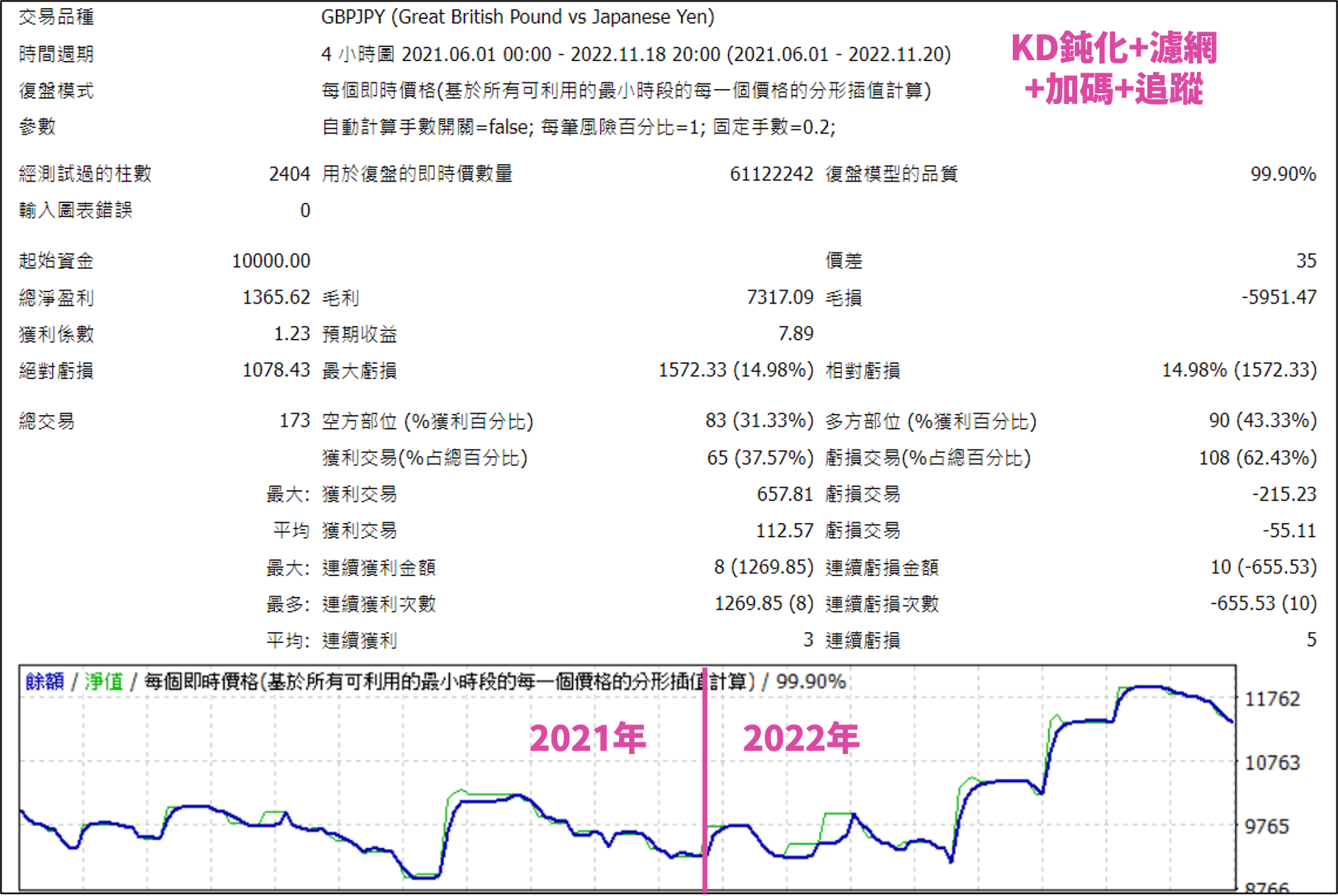 我們先來看原本的KD鈍化+高低點濾網(沒有加碼與追蹤止損):